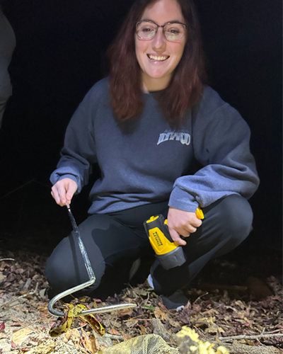 Rose Horn practices safe venomous snake handling techniques at the 2022