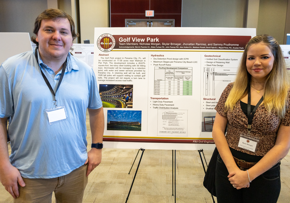 The Golf Park project will be constructed on 17.58 acres in Panama City, FL, right next to the Walmart in Pier Park. This development project is a 49,675-square-foot golf recreational park with 56 hitting bays over two stories. The two-story building is going to be a steel construction due to the number of loadings on this building and the ease of construction. The site's current condition is a vacant parcel with mostly slash pines that slope from the north to south of the property. In the property's southwest corner, there are a few wetlands that the development will not impact. For this development, there will be one stormwater retention pond that will facilitate the whole development. The stormwater will be handled by grading water toward the SWMF and routing the water through SWMF pipes that carry the water to the SWMF pond. The development will access water and sewer taps from Panama City water and sewer, and these taps from the city will provide services for restaurants and restrooms. The project is also going to require a retaining wall. The retaining wall will be located at the end of the hitting area to keep the ground level from the hitting bays to the back end of the hitting area. The project will increase the traffic going onto the access roads; however, the property will not increase the traffic volume, so a turn lane needs to be constructed as well. For the hitting area, there will be 150ft tall poles will hold the netting that keeps the golf balls on the parcel.